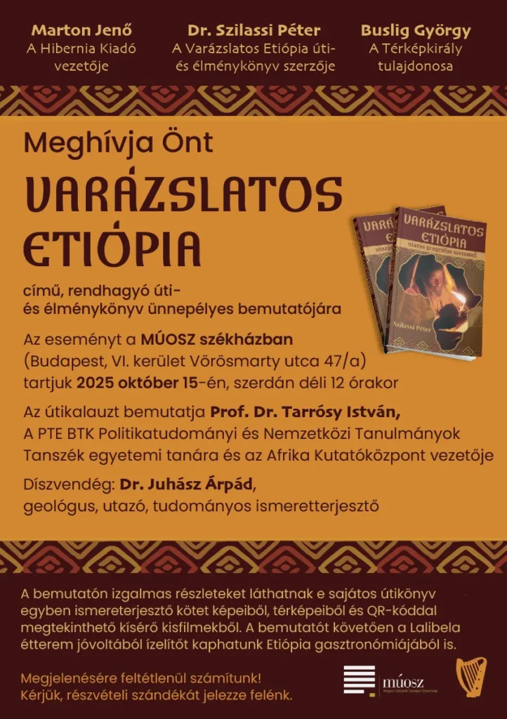 Dr. Szilassi Péter Varázslatos Etiópia című úti és élménykönyv bemutatójára a MÚOSZ székházban (Bp.1064 Vörösmarty u 47/a) a Rát-Táncsics teremben, 2025 október 15-én 12.00-kor kerül sor.