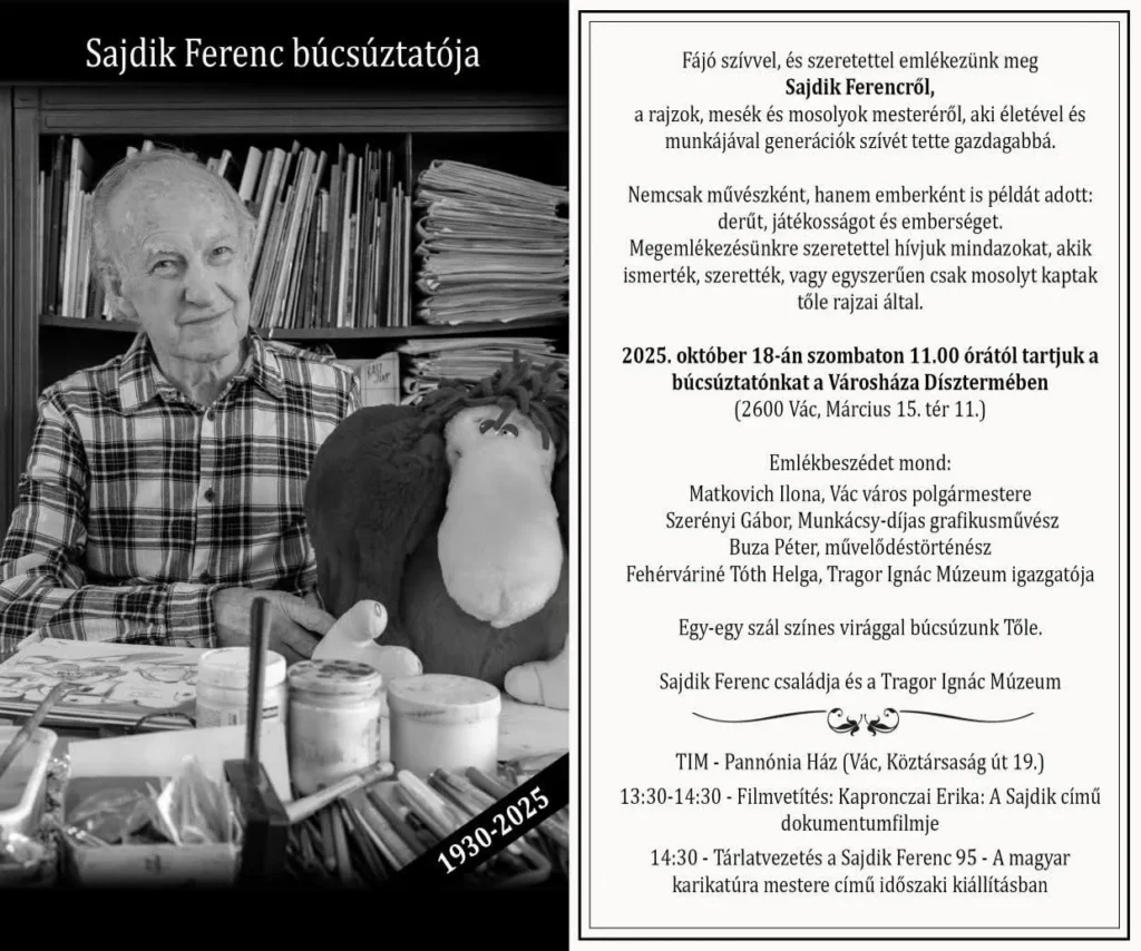 A búcsúztatás után filmvetítés lesz, 13.30-tól Kaproncai Erika: Sajdik Ferenc című dokumentumfilmjét mutatjuk be. Majd tárlatvezetés lesz 14.30-tól Sajdik Ferenc 95 – A magyar karikatúra mestere című időszaki kiállításon.