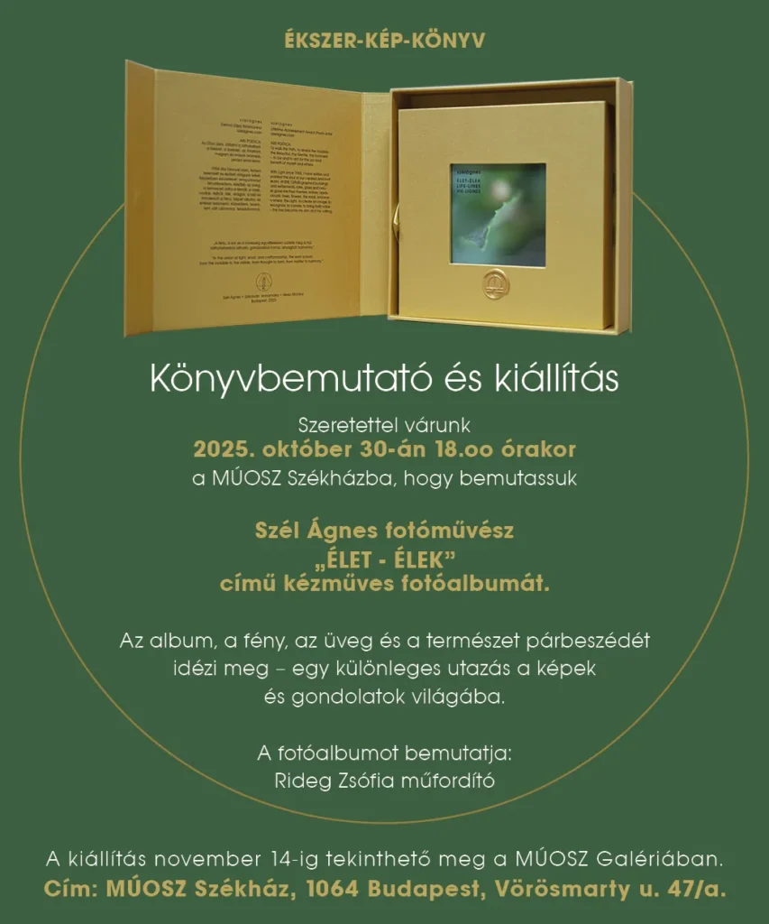 Szeretettel várunk 2025. október 30-án 18 órakor a MÚOSZ Székházba, hogy bemutassuk Szél Ágnes fotóművész „Élet-élek” című kézműves fotóalbumát.