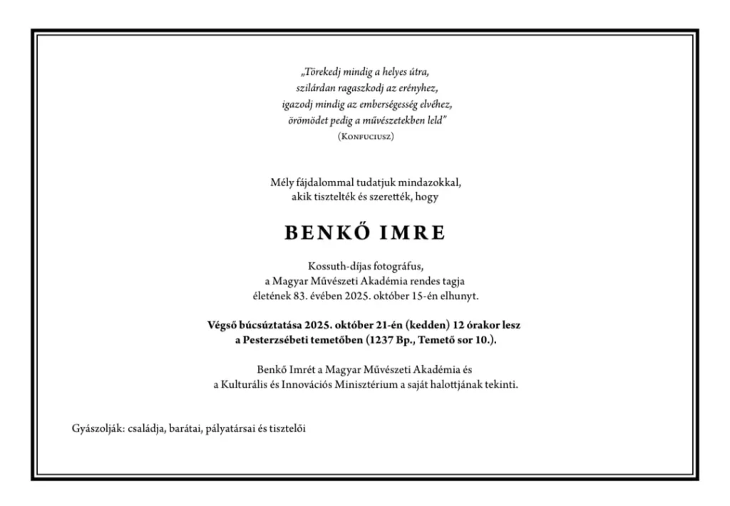 82 éves korában meghalt Benkő Imre, a második világháború után induló nagy fotósgeneráció második hullámának kiemelkedő és meghatározó tagja, akinek dokumentarista munkássága rengeteg fotóst inspirált Magyarországon.