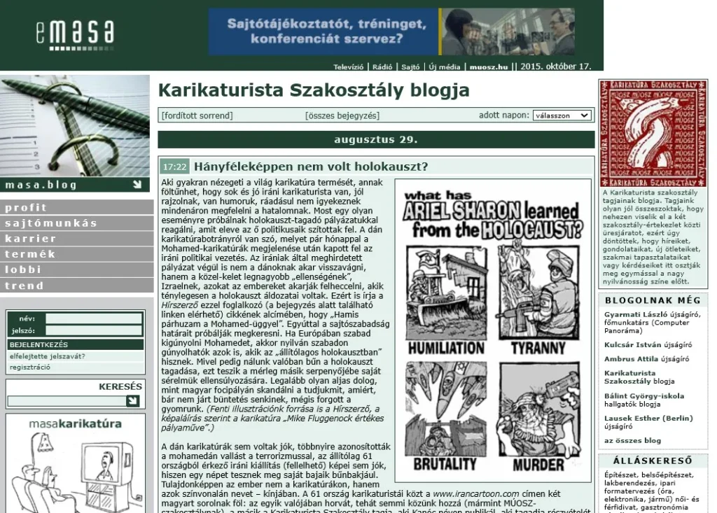 Régi blogunk első bejegyzése a Mohemedet gúnyoló dán karikaturistáknak visszavágni akaró iráni holokauszt-tagadó karikatúra pályázatról szól. Ekkor kezdődött az a máig tartó korszak a karikaturisták életében, amikor az erőszak és a politikai nyomás akarta meghatározni a műfaj határait. 2015-ben váltottunk saját weblapra.