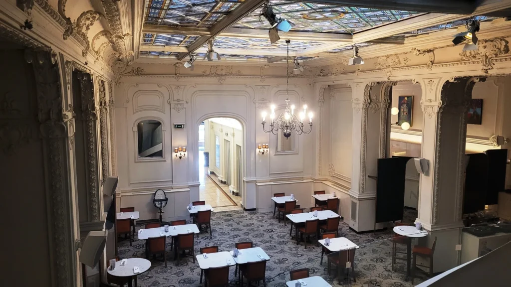 Ahogy részben megmaradt az udvart fedő üvegtető is, legalábbis a szélső betétekben, és jelenleg is az étterem részét képezi. Természetesen ez a rész is modernebb lett, de a falak, a stukkók és az atmoszféra megmaradt, így továbbra is hatalmas élményt jelent akár szállóvendégként, akár csak a kávézóba beülni napjainkban is.