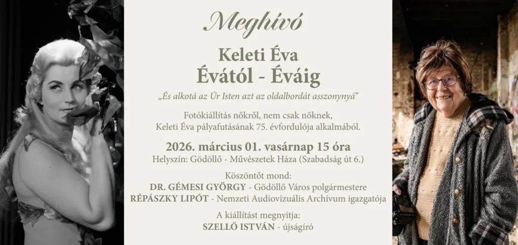 Gödöllőn a művészetek házában lesz a megnyitó, 2026. március 1-én vasárnap 15.00-tól. Fotókiállíáts nőkről nem csak nőknek – címmel Keleti Éva pályafutásának 75. évének évfordulójára nyílik kiállítás az életműből.